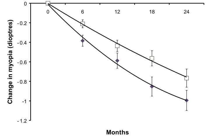 ABSTRACT: "The effect of myopic defocus on myopia progression was assessed in a two-year prospective study on 94 myopes aged 9-14 years, randomly allocated to an undercorrected group or a fully corrected control group. The 47 experimental subjects were blurred by approximately +0.75 D (blurring VA to 6/12), while the controls were fully corrected Undercorrection produced more rapid myopia progression and axial elongation (ANOVA, F(1,374)=14.32, p<0.01). Contrary to animal studies, myopic defocus speeds up myopia development in already myopic humans. Myopia could be caused by a failure to detect the direction of defocus rather than by a mechanism exhibiting a zero-point error."