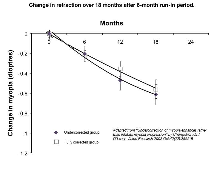 Following is the abstract and a graph from the paper that supposedly proved that undercorrection of myopia causes a significant increase in myopia progression ("Undercorrection of myopia enhances rather than inhibits myopia progression" by Chung/Mohidin/O'Leary, Vision Research 2002 Oct;42(22):2555-9). The experiment was conducted in Kuala Lampur, Malaysia, and used Chinese and Malay schoolchildren as subjects.